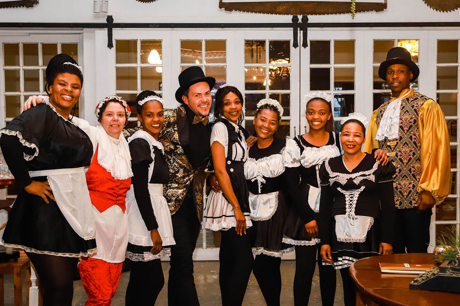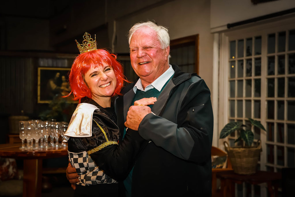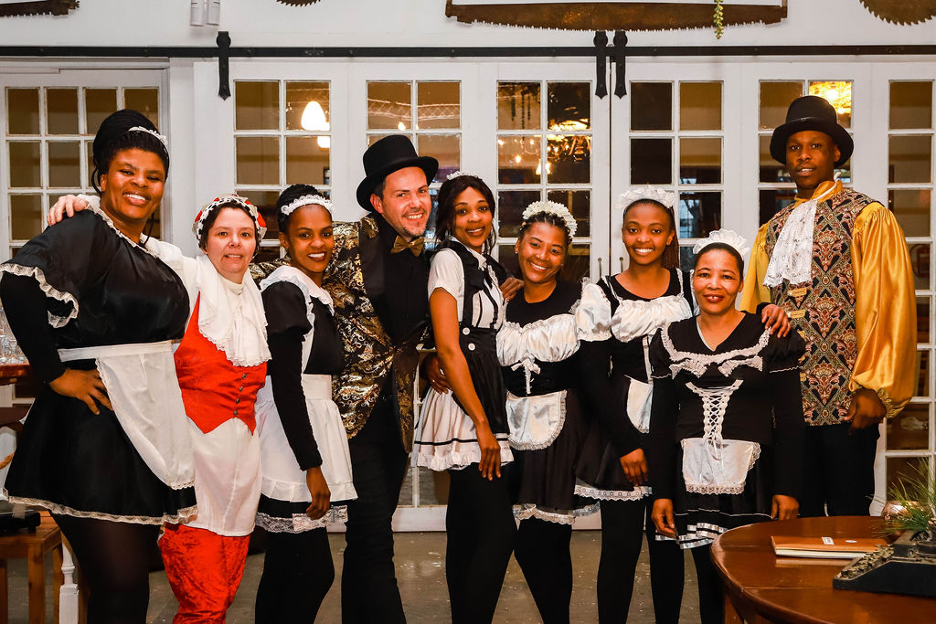 Guests were greeted by uniformed guards at the door, and our waitstaff, dressed as palace servants, added to the authentic royal atmosphere. The highlight of the evening was the arrival of a real queen, dressed in full regal attire. As she entered the dining hall, all guests stood in respect, setting the tone for a night of sophistication and grandeur. The queen and her guests were serenaded throughout the evening with the enchanting sounds of Simon Shaw and James v.d Merwe on vocals, guitar and saxophone.