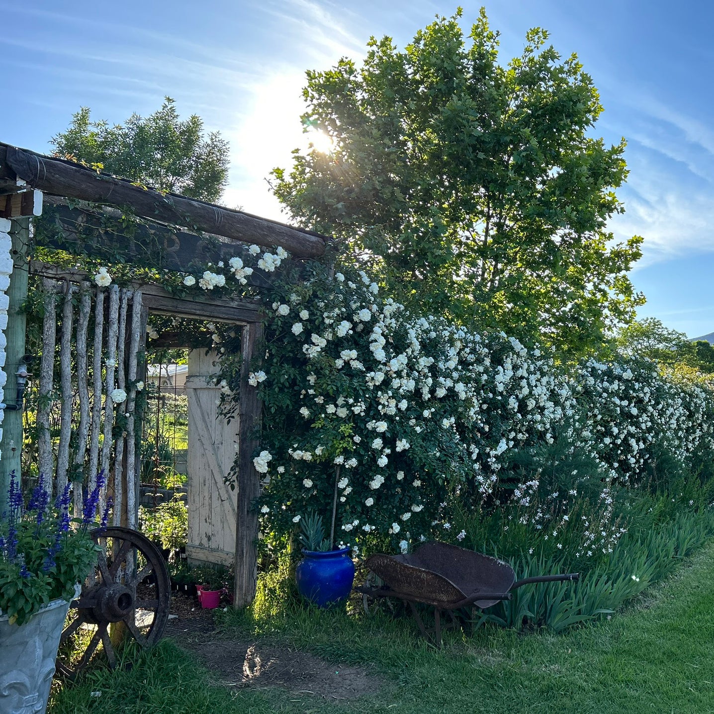 At De Oude, our gardens are a true paradise for both the eyes and the soul. Nestled amidst breathtaking mountainous scenery, the garden is lush, green, and bursting with vibrant blooms and fragrant white iceberg roses that fill the air with their delicate scent. Whether you're strolling through the pathways—barefoot or not—or spreading out a blanket for a family picnic on our expansive lawns, you'll find peace and beauty at every turn.